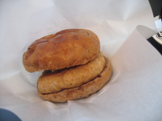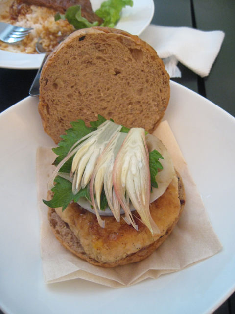 10種雑穀を練り込んだバンズにチキンパテ、レンコン、大葉、茗荷を挟んで醤油ソースで味付けされた
