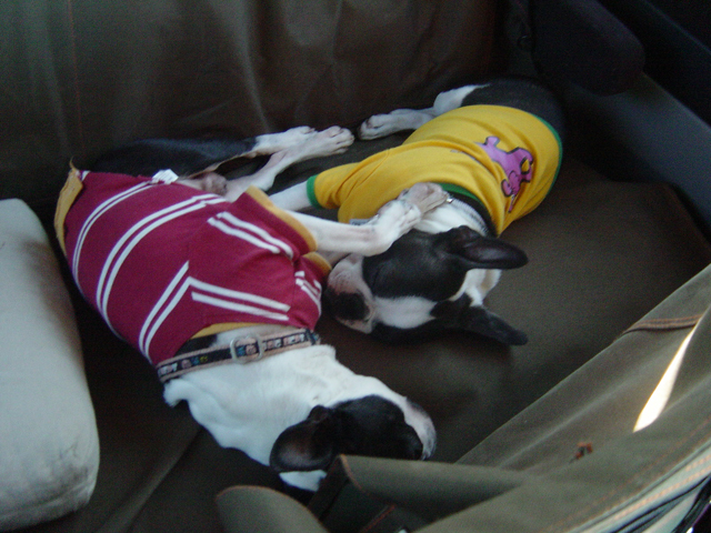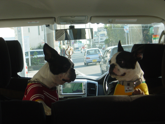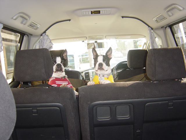 行きの車では朝の散歩にも行ってないのにグッスリな二匹。