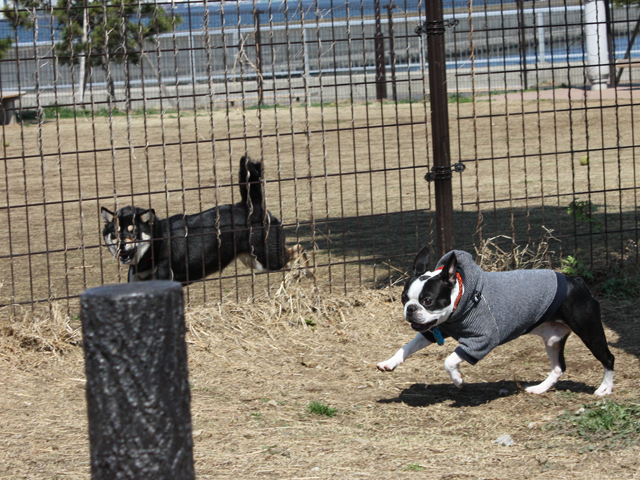 柵の向こうの無差別ゾーンにいる犬と柵越しに走っちゃったりして。