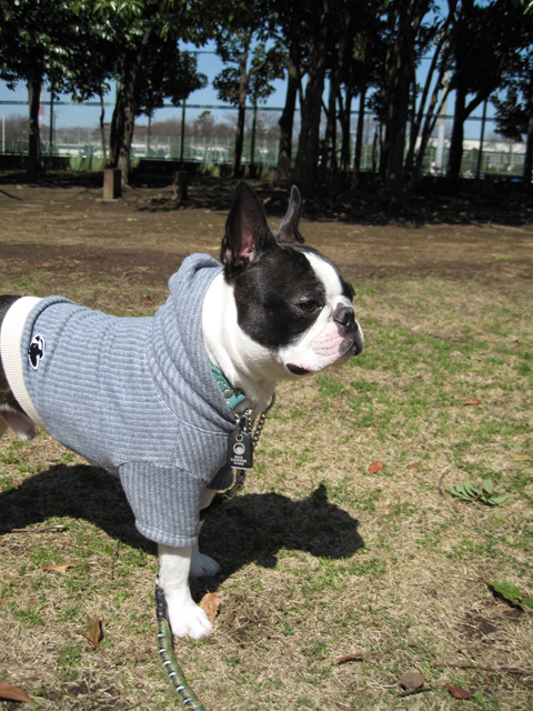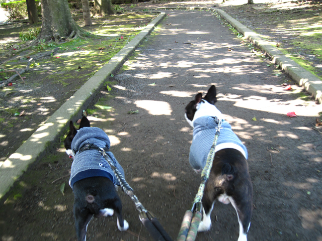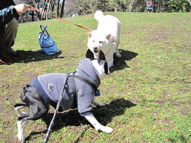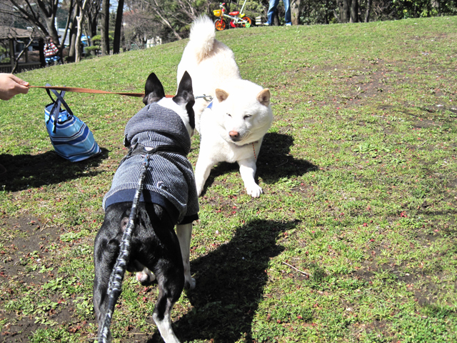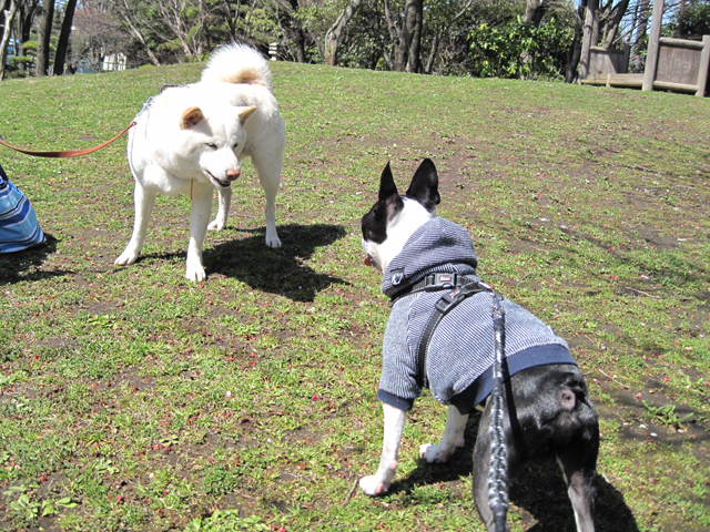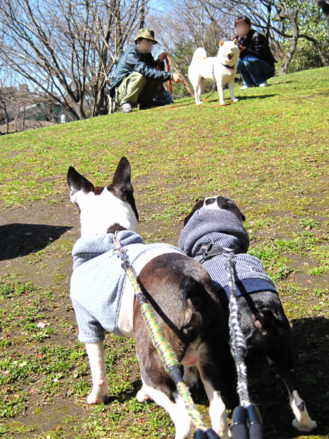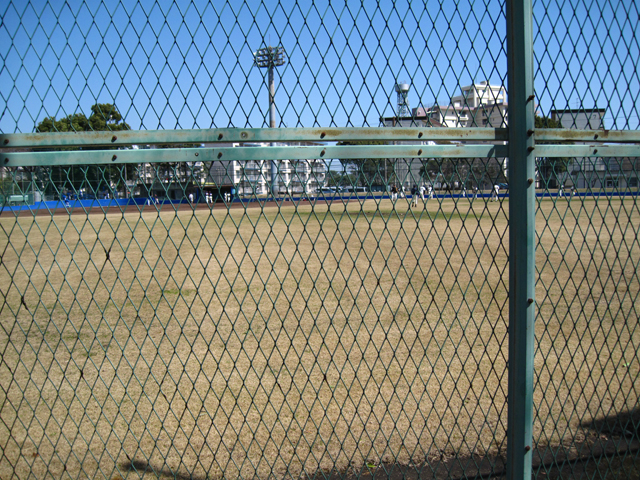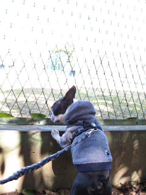 六と汐はフェンスに前足をかけて草野球を一瞬かぶりついて見てみたり、