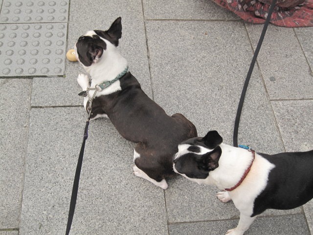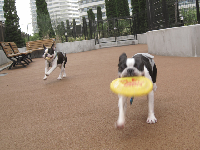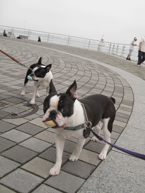 二匹でアニマルホッピーを咥えて散歩する、不思議な図の完成。