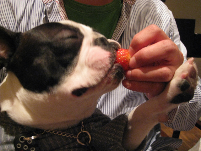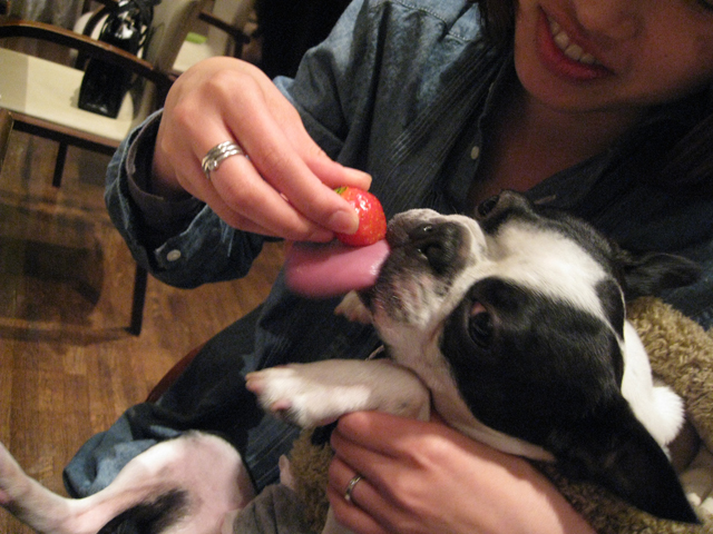 席に戻って、バイキングにあったイチゴをあげてみると。。。
