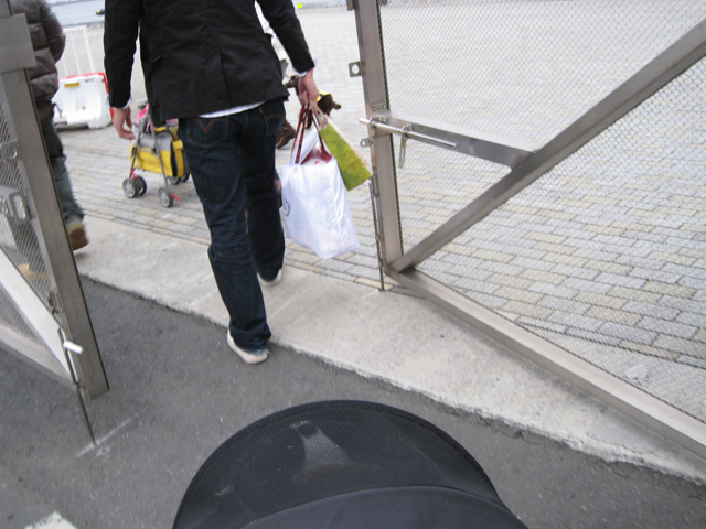 犬は客船ターミナルには入れないので、荷物搬入口から乗り場に向かいます。