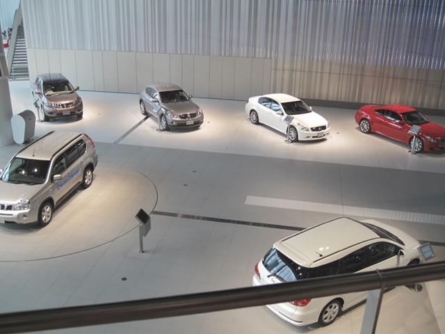 通路から見えるギャラリーにはたくさんの日産車の展示があります。