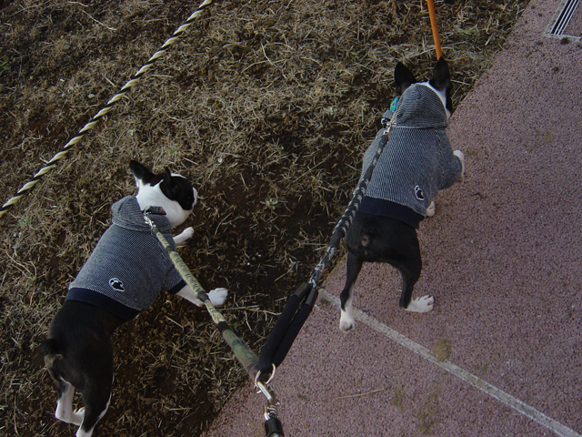けど久しぶりに外の空気を吸い、しかも二匹いっぺんの散歩は更に久しぶりだったので