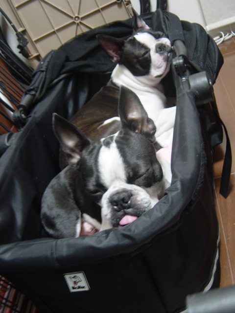 バラバラだったのに、バギーの中で仲良くお休み中でした。