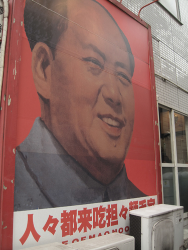 毛沢東の肖像画がデカデカと描かれている、店内にも毛沢東グッズが