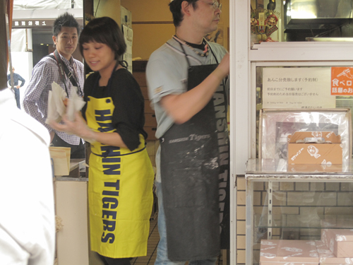 阪神のユニフォームに阪神のエプロン、店内には阪神のカレンダーです。