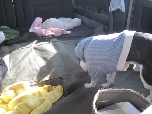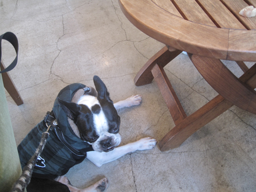 他のワンさんにそわそわし始めたので、カフェマット(ラグ)をお借りして