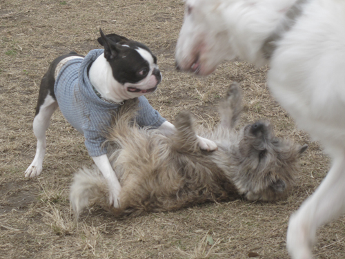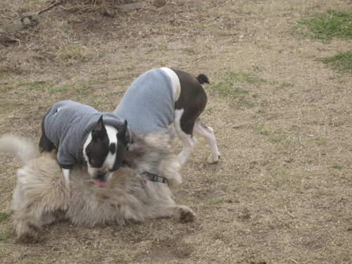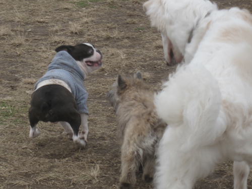 ただ、まだ大きな犬は得意じゃないようで、この白い子も遊びに混ざりに来るんですけど