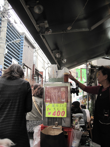 酒屋さんの店頭で琥珀エビスの生ビールを買い店の前にあるビールケースに
